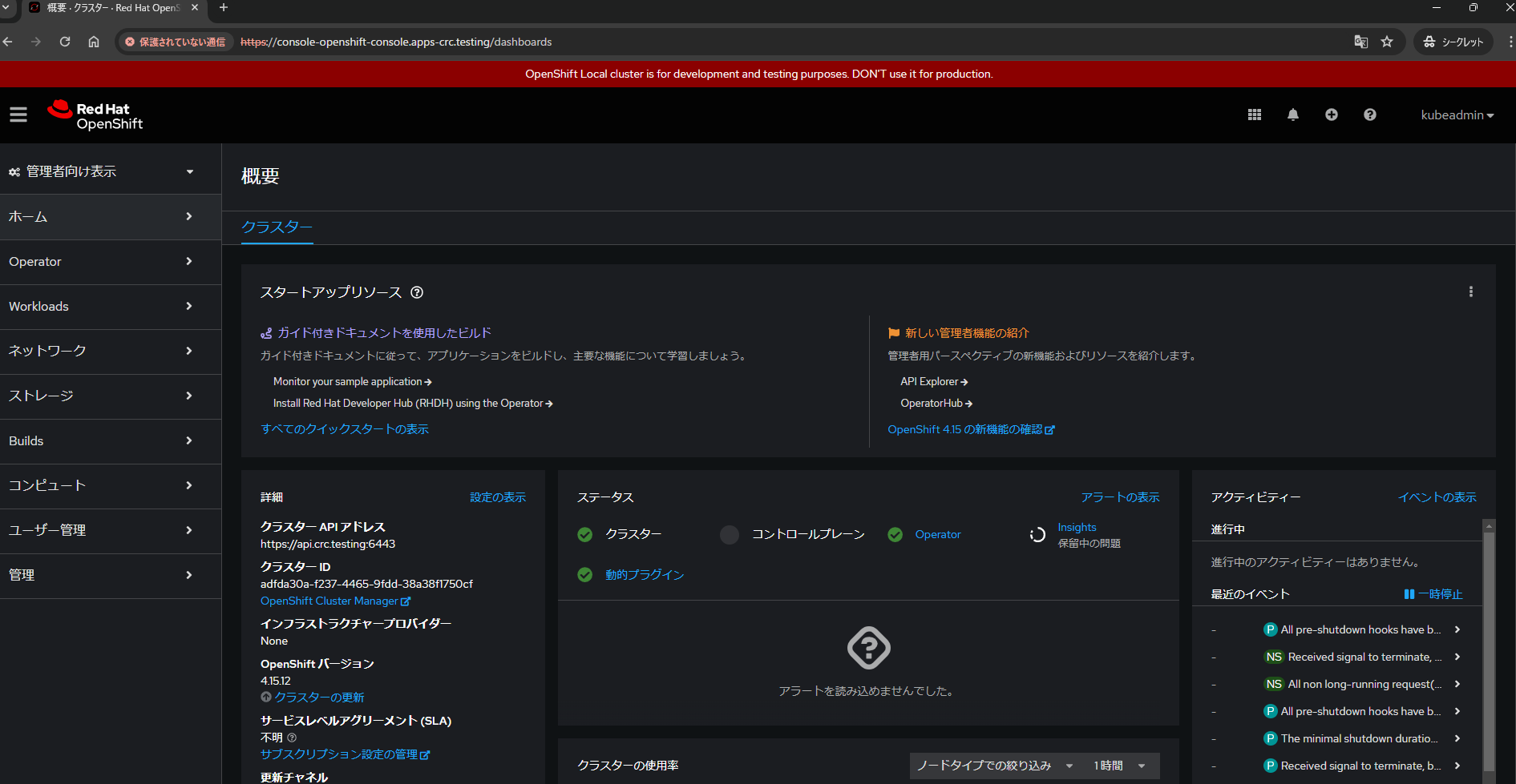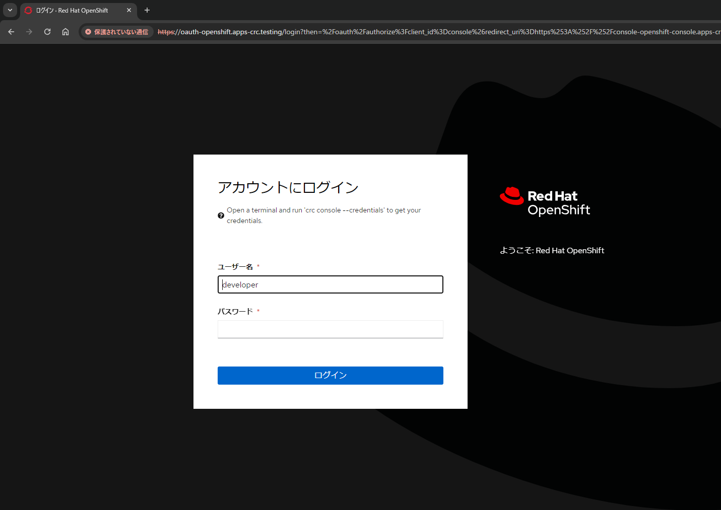 Windowsのブラウザから”https://console-openshift-console.apps-crc.testing"にアクセスします。
