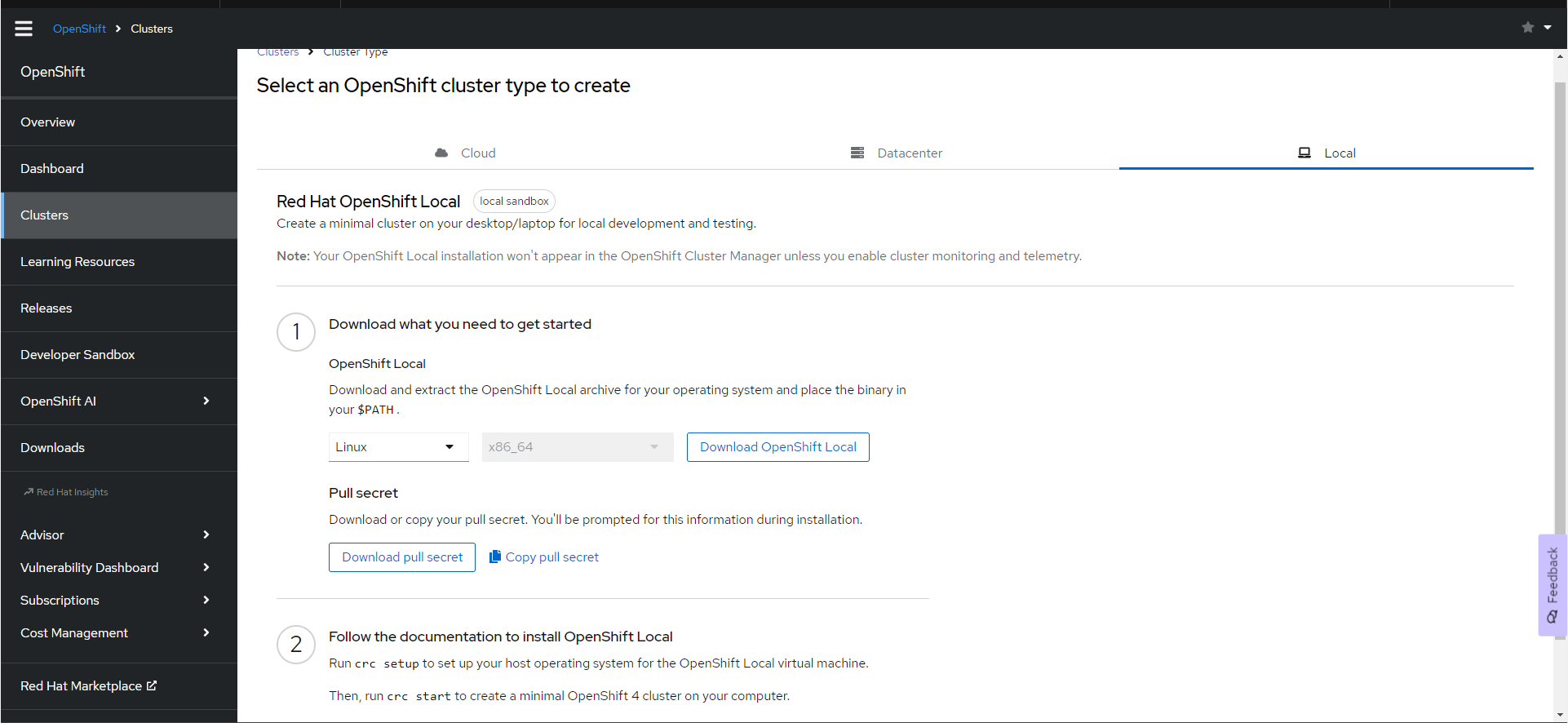 - [Download what you need to get started]から[Linux]を選択後、 [Download OPenShift Local]をクリックしてファイルをダウンロード
