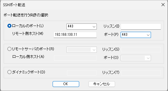 SSHポート転送画面にて、[OK]を選択して設定を保存